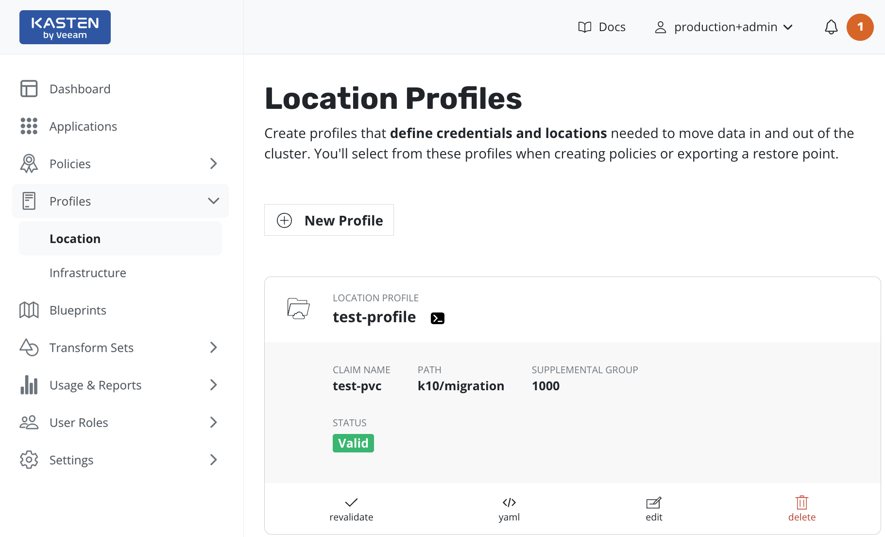 If the location profile is used for exporting an application for cross-cluster migration, it will be used to store application restore point metadata and, when moving across infrastructure providers, bulk data too. Similarly, location profiles are also used for importing applications into a cluster that is different than the source cluster where the application was captured.