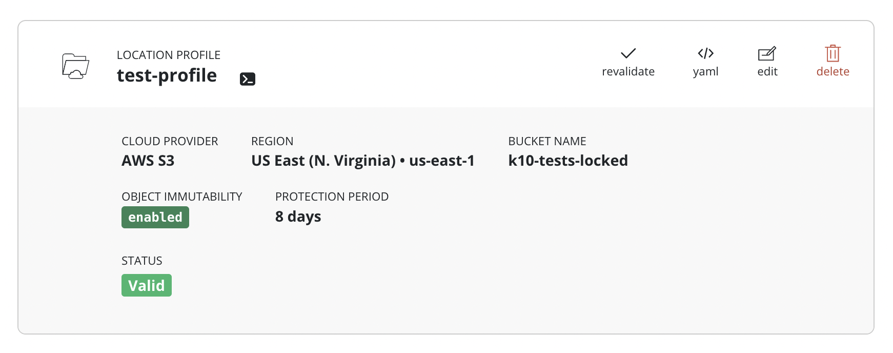 Push the "Save Profile" button. The profile will be submitted to K10 and will appear in the list of Location Profiles. The card will reflect the object immutability status of the referenced bucket, as well as the selected protection period. This profile can now be selected as an export destination, and any restore points exported there will be immutable and protected for the selected protection period.