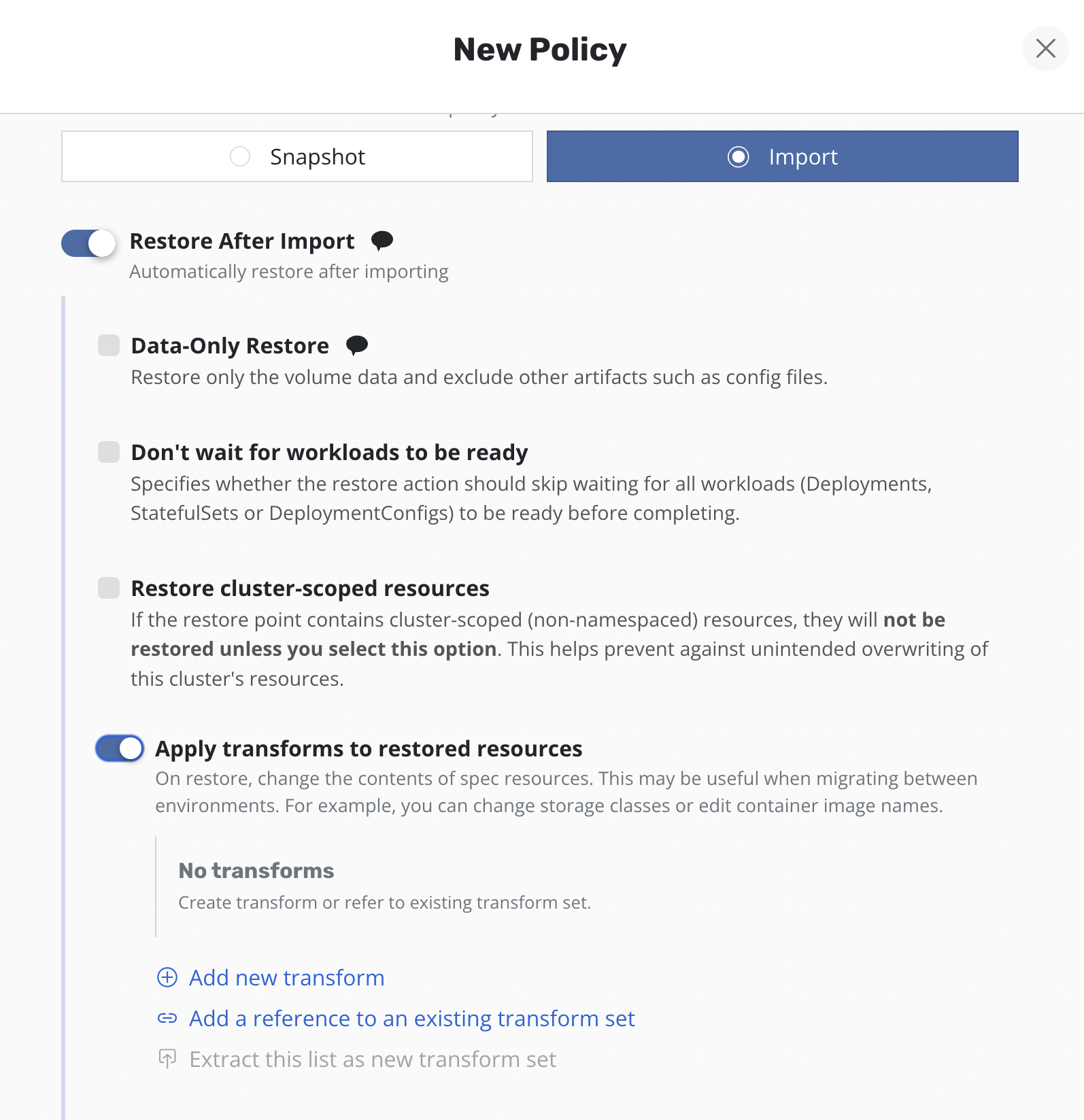 Apply transforms to restored resources under Restore After Import.