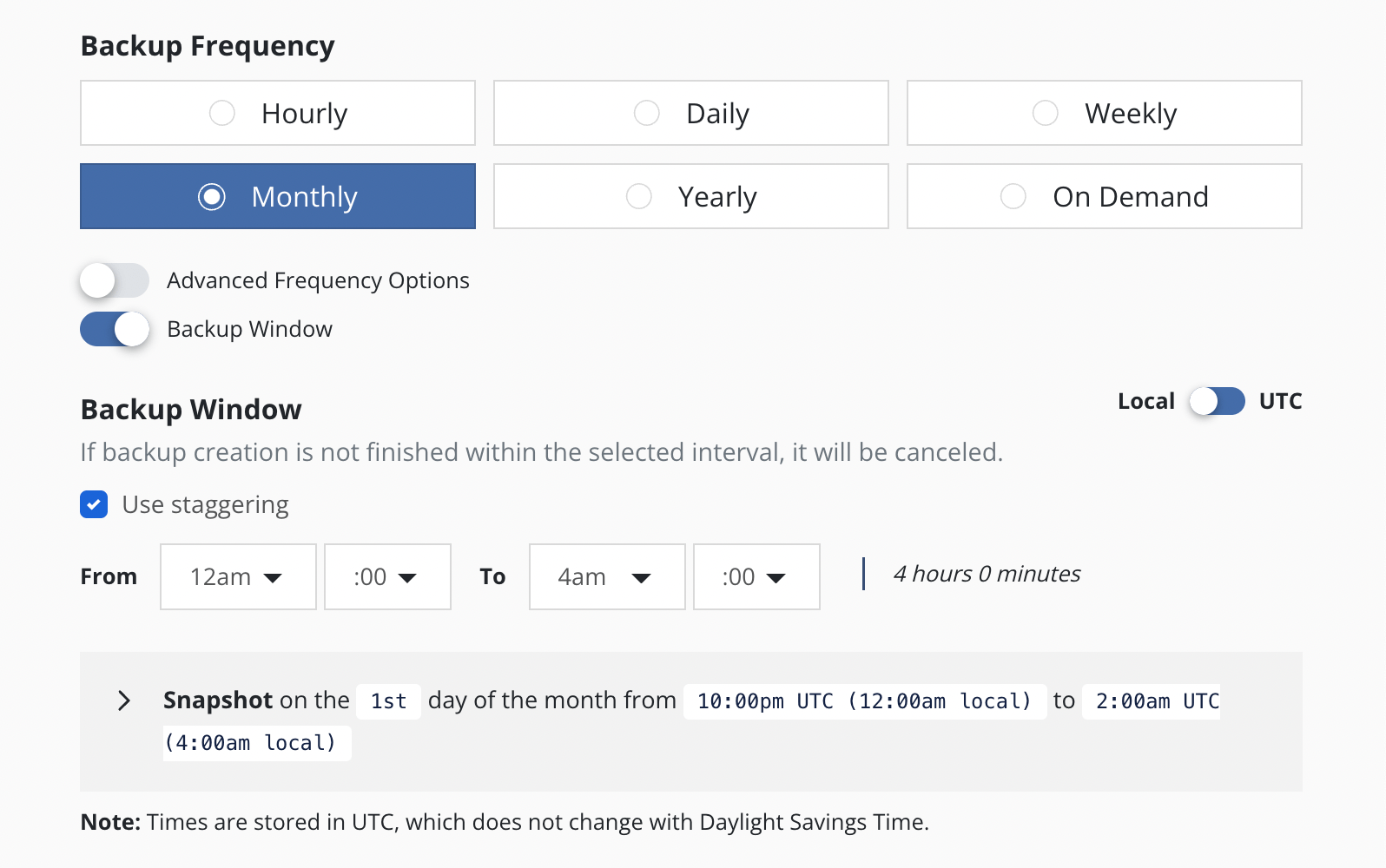 Backups performed via exports, by default, will be set up to export every snapshot into a backup. However, it is also possible to select a subset of snapshots for exports (e.g., only convert every daily snapshot into a backup).