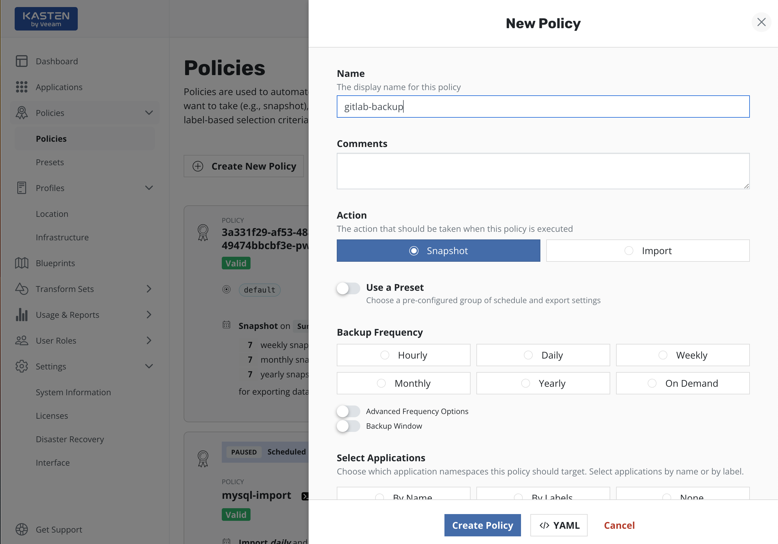 All policies center around the execution of actions and, for protecting applications, you start by selecting the snapshot action with an optional backup (currently called export) option to that action.