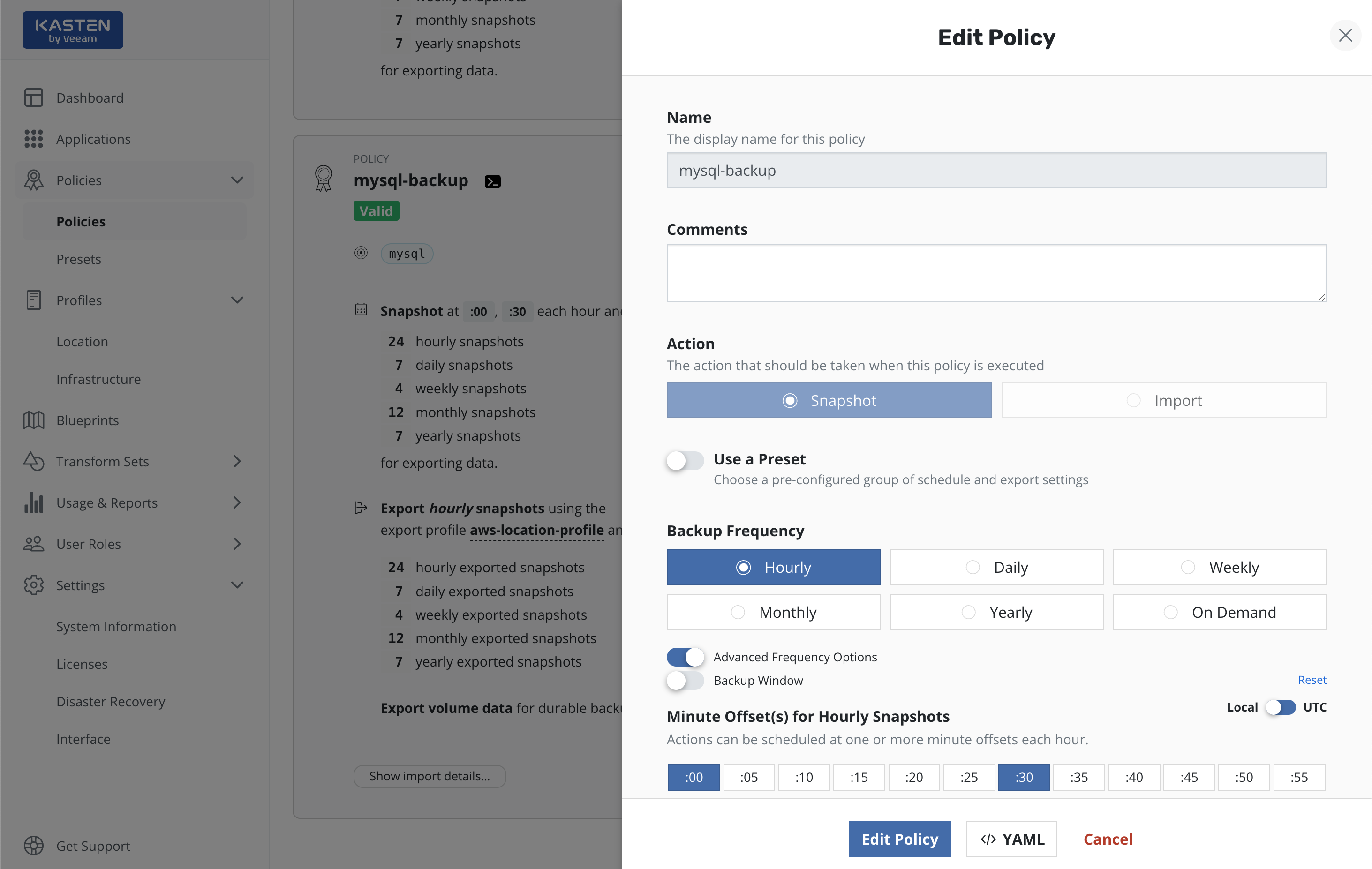 A powerful scheduling feature in K10 is the ability to use a GFS retention scheme for cost savings and compliance reasons. With this backup rotation scheme, hourly snapshots and backups are rotated on an hourly basis with one graduating to daily every day and so on. It is possible to set the number of hourly, daily, weekly, monthly, and yearly copies that need to be retained and K10 will take care of both cleanup at every retention tier as well as graduation to the next one. For on demand policies it is not possible to set a retention schedule.