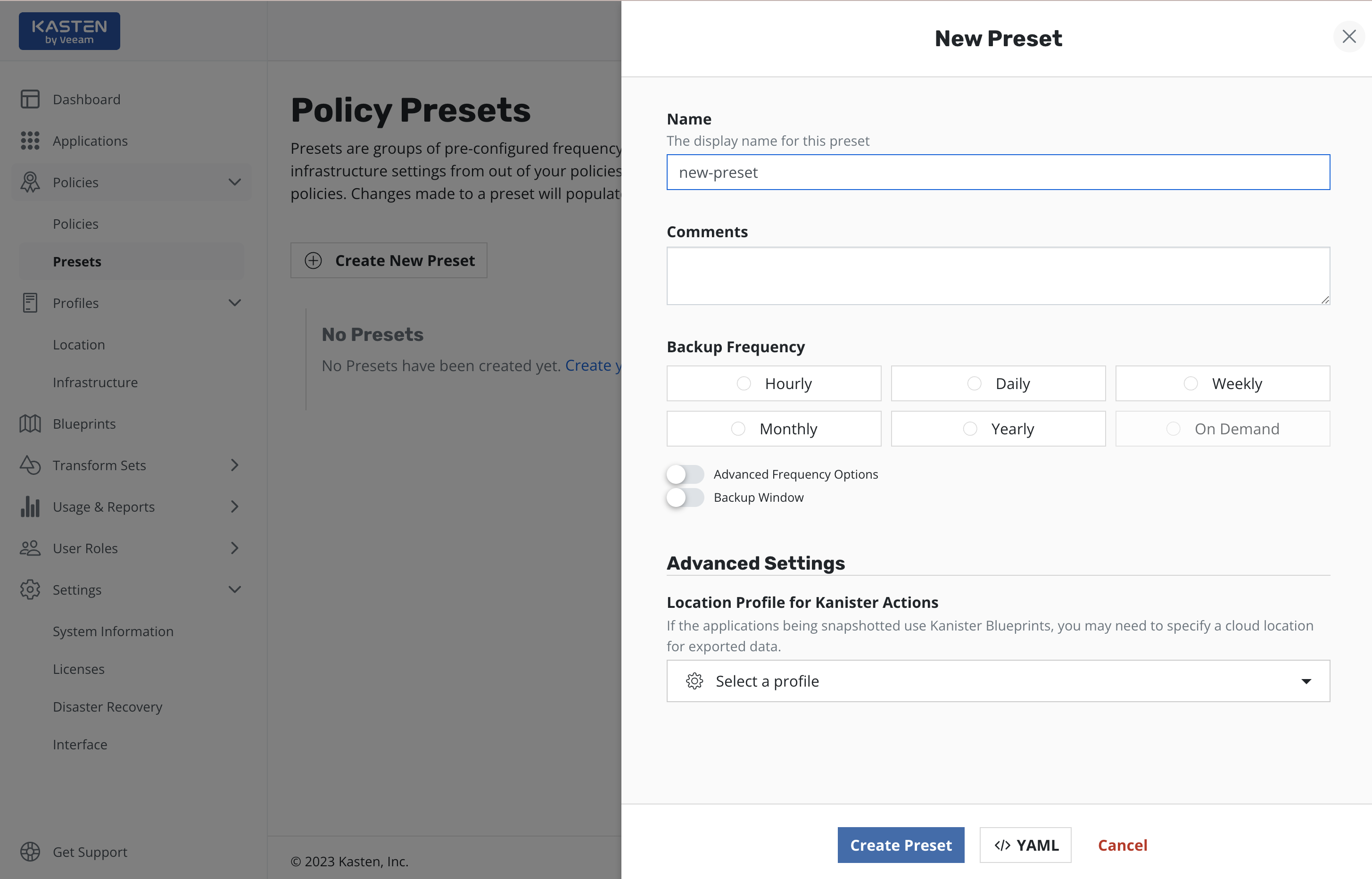 Operations teams can define multiple protection policy presets that specify parameters such as schedule, retention, location and infrastructure. A catalog of organizational policy presets and SLAs can be provided to the development teams with an intimate knowledge of application requirements, without disclosing credential and storage infrastructure implementation. This ensures separations of concerns while scaling operations in a cloud-native environment.