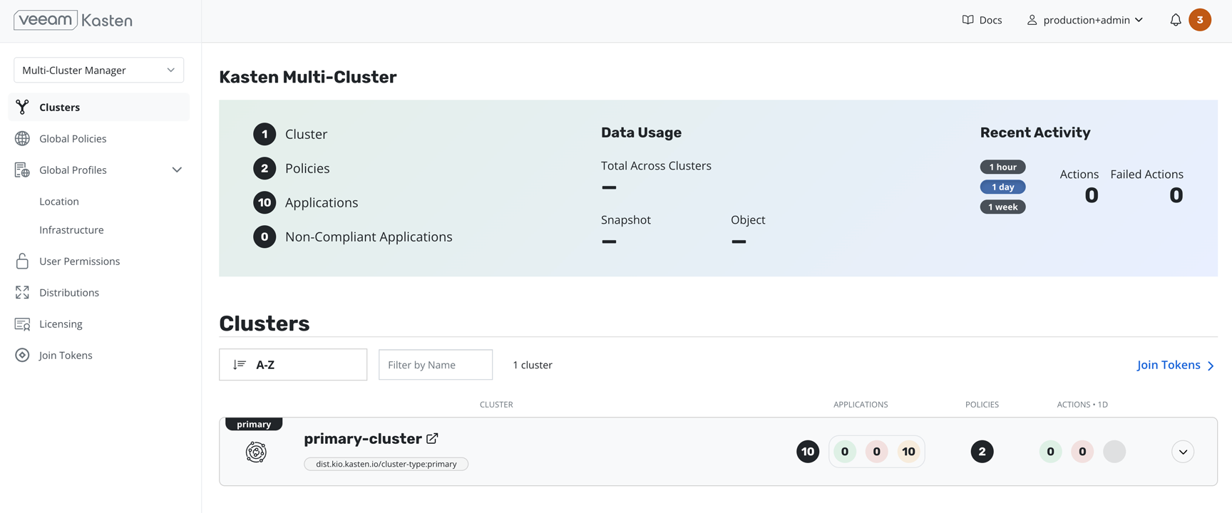 When the promotion is successful, the application will redirect to the new Multi-Cluster Manager page, where the primary cluster should be visible in the list of clusters.