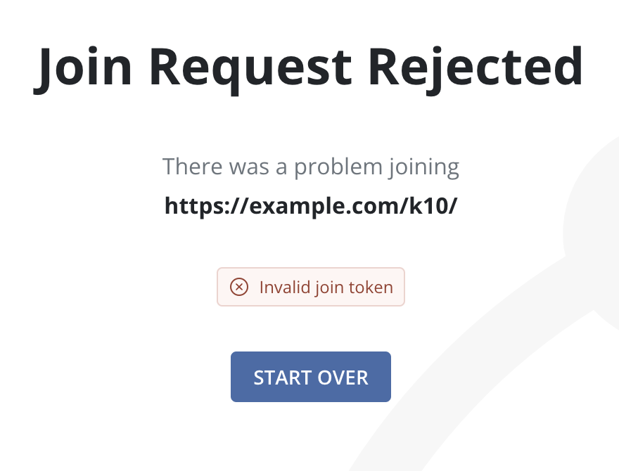 If a Join Request is rejected (due to an expired token), an option to try again will be displayed, and users can return to the Join a Multi-Cluster form by clicking the Start Over button.