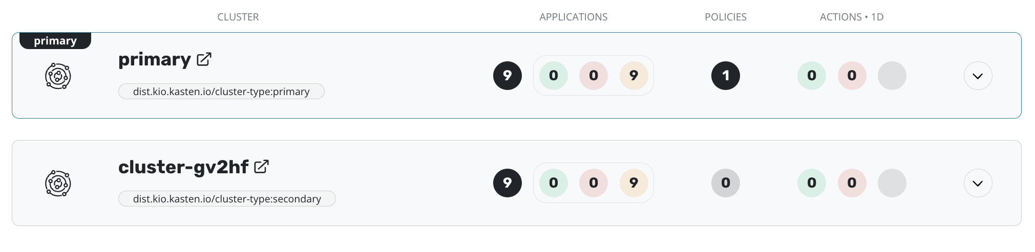 K10 Multi-Cluster Manager allows for an aggregated view of all clusters configured in the system. Clusters can be filtered by name or labels. Each cluster displays application, policy and actions information.