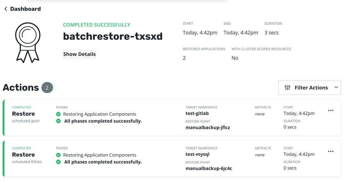 Once applications have been protected via a policy or a manual action, it is possible to restore them in-place or clone them into a different namespace.