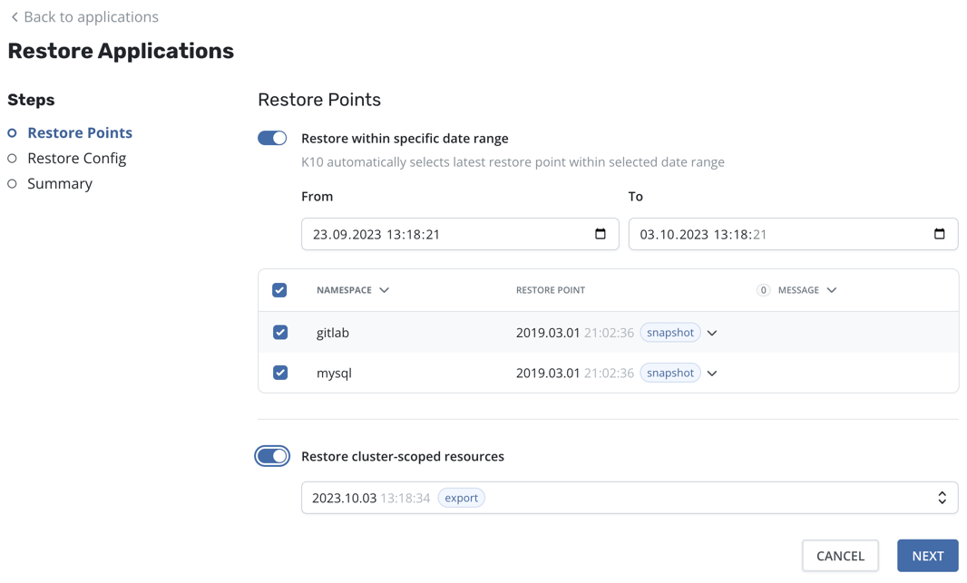When a valid restore point has been picked up for each selected application, click the "Next" button to proceed to the next step, Restore Configuration. This step contains modified options from the single application restore workflow. For instance, it is possible to add a prefix/suffix to the target namespace or filter resources.